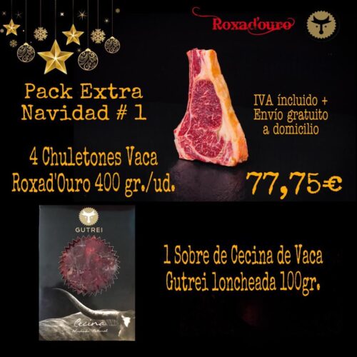 ¡Haz de tus comidas de Navidad un momento único con este exclusivo pack de chuletones de vaca Roxad'Ouro y sabrosa cecina de buey! Incluye: